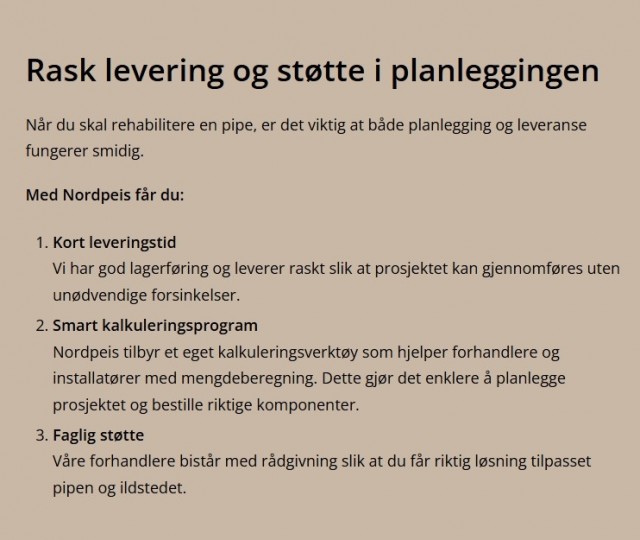 Nordpeis leverer også raskt og effektivt, slik at prosjekter ikke stopper opp. Vi har kort leveringstid og god lagerføring slik at du kommer raskt i gang med rehabiliteringen.